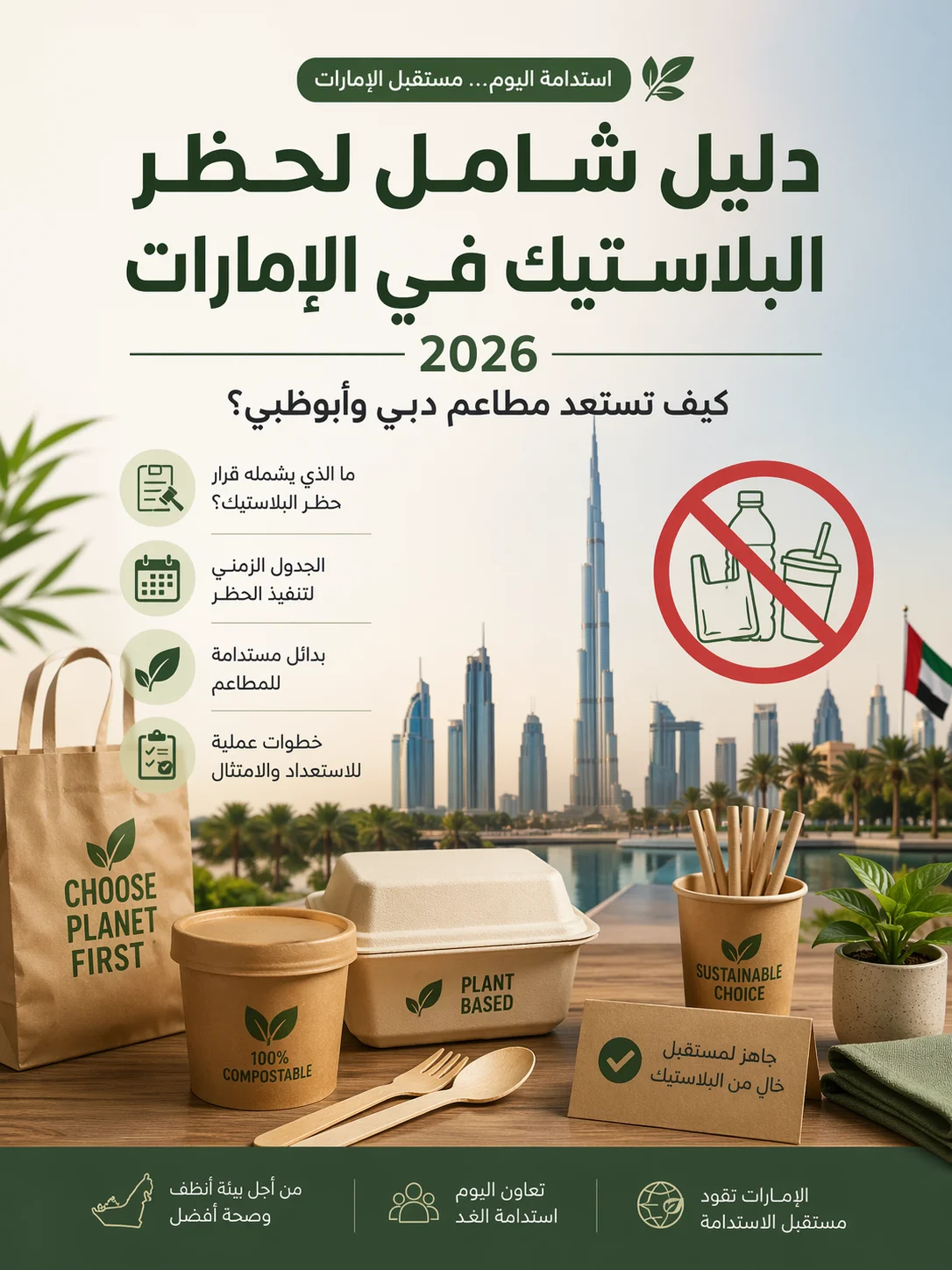 إذا كنت تمتلك مطعماً أو كافيهاً أو أي منشأة غذائية في الإمارات العربية المتحدة، فإن عام 2026 يمثل نقطة تحول جذرية لا يمكنك تجاهلها. قرار حظر البلاستيك في الإمارات 2026 ليس مجرد توجيه بيئي عابر، بل هو تشريع ملزم قانونياً سيُعيد رسم خريطة قطاع التغليف والتعبئة بالكامل في دبي وأبوظبي والشارقة وسائر الإمارات.